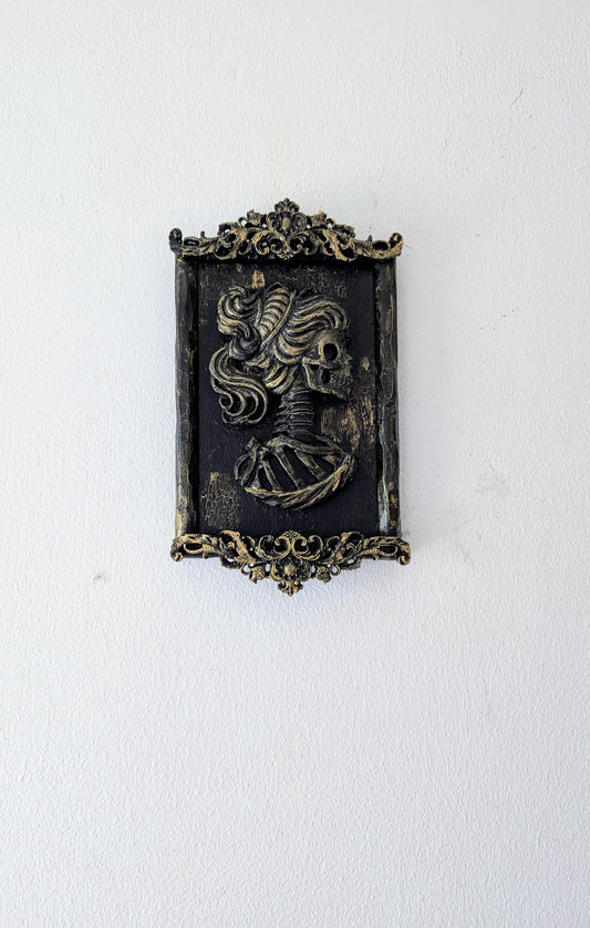 Small decorative wall hanging plaque hand made unique 3d art gothic baroque black + gold lady female skeleton skull home decor accent gift