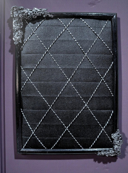 Small Gothic inspired portrait memo letter notice pin board. Unique home office bar decor Blackened silver crow skulls + roses.