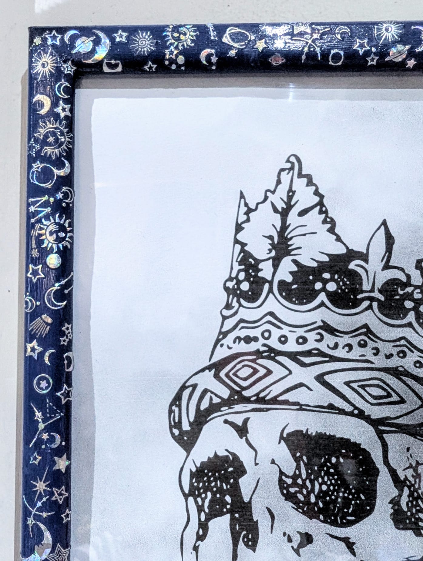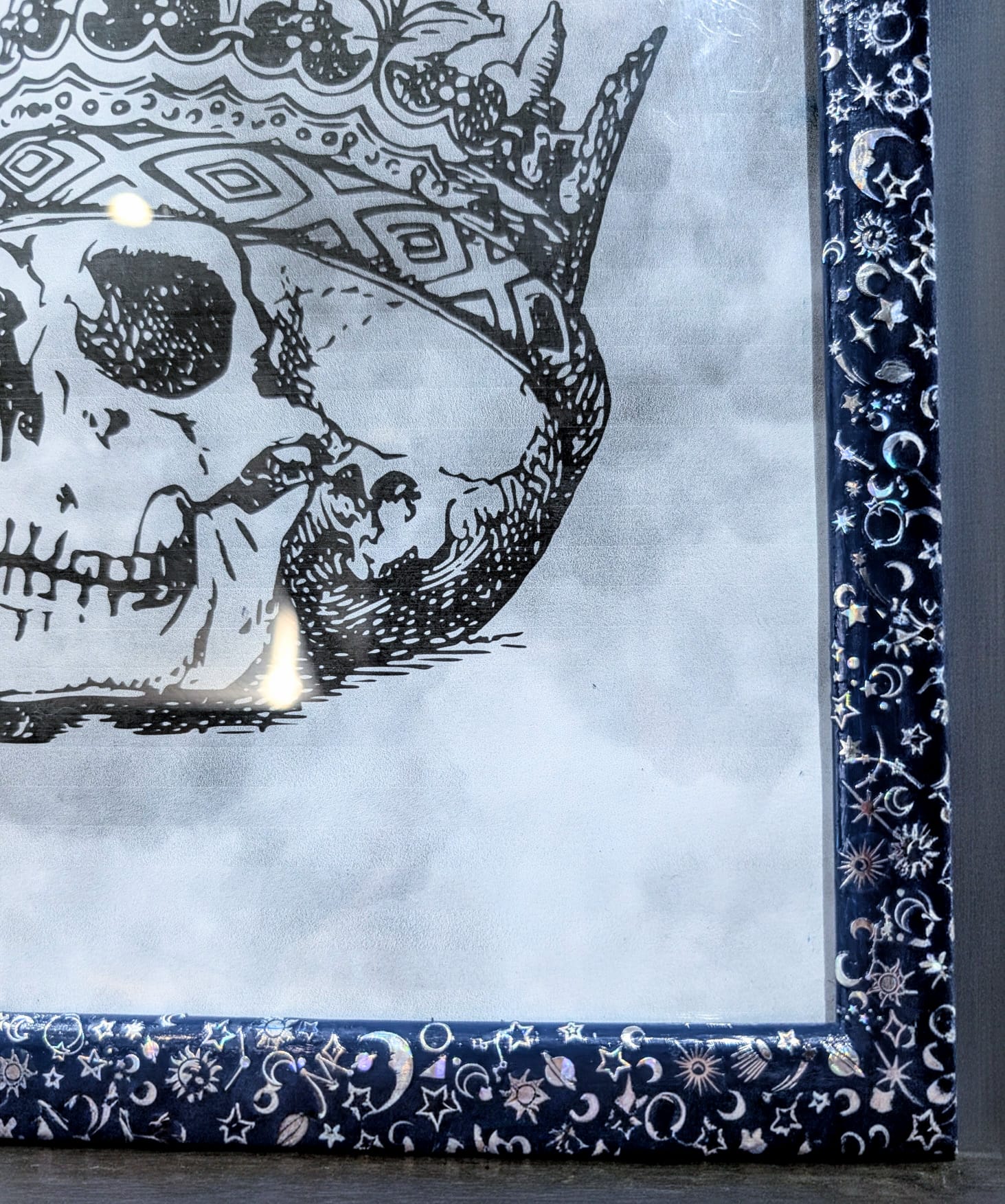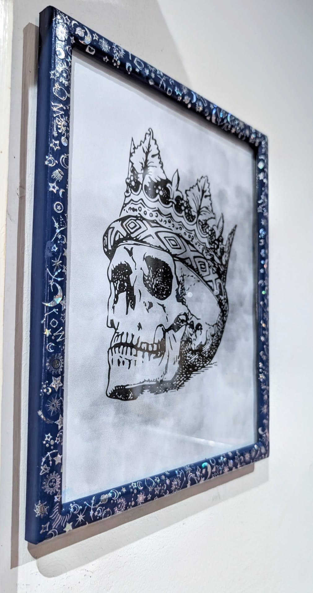 Hand-painted in blue, with silver holographic celestial transfers, all of which have been coated in clear varnish.