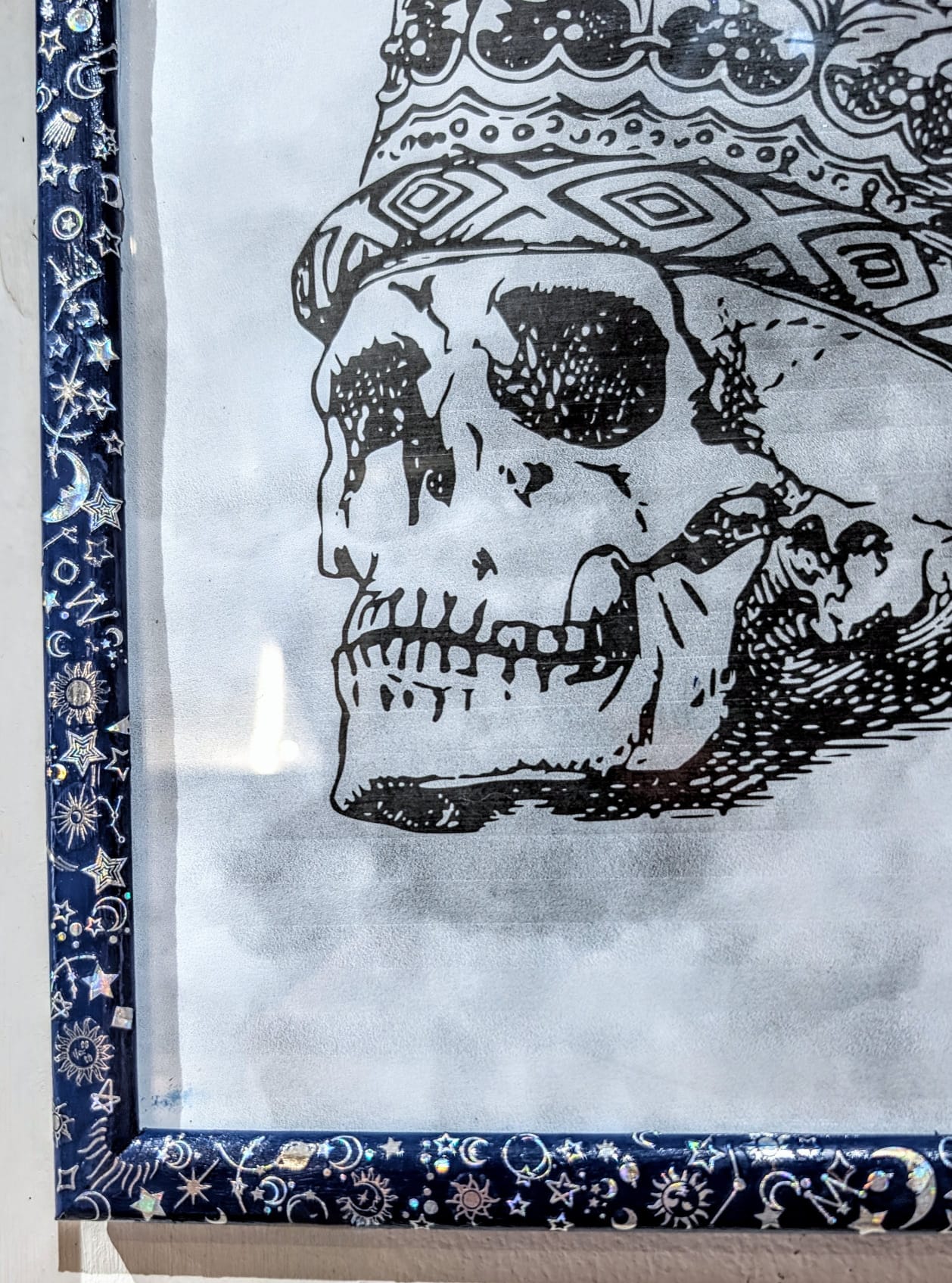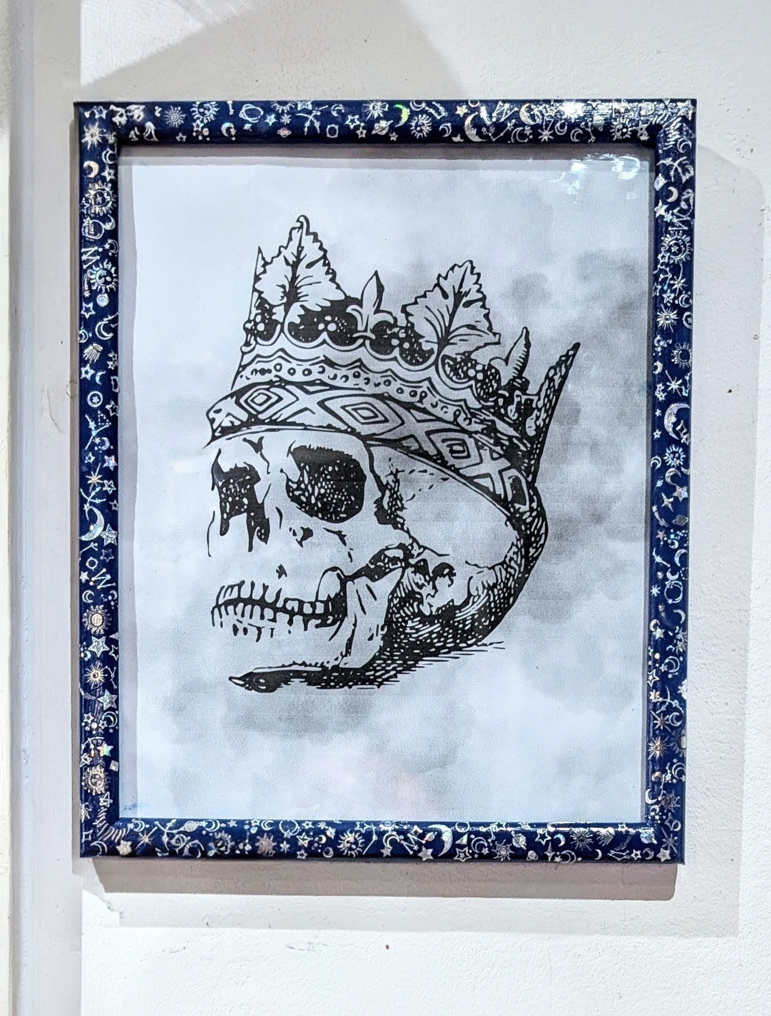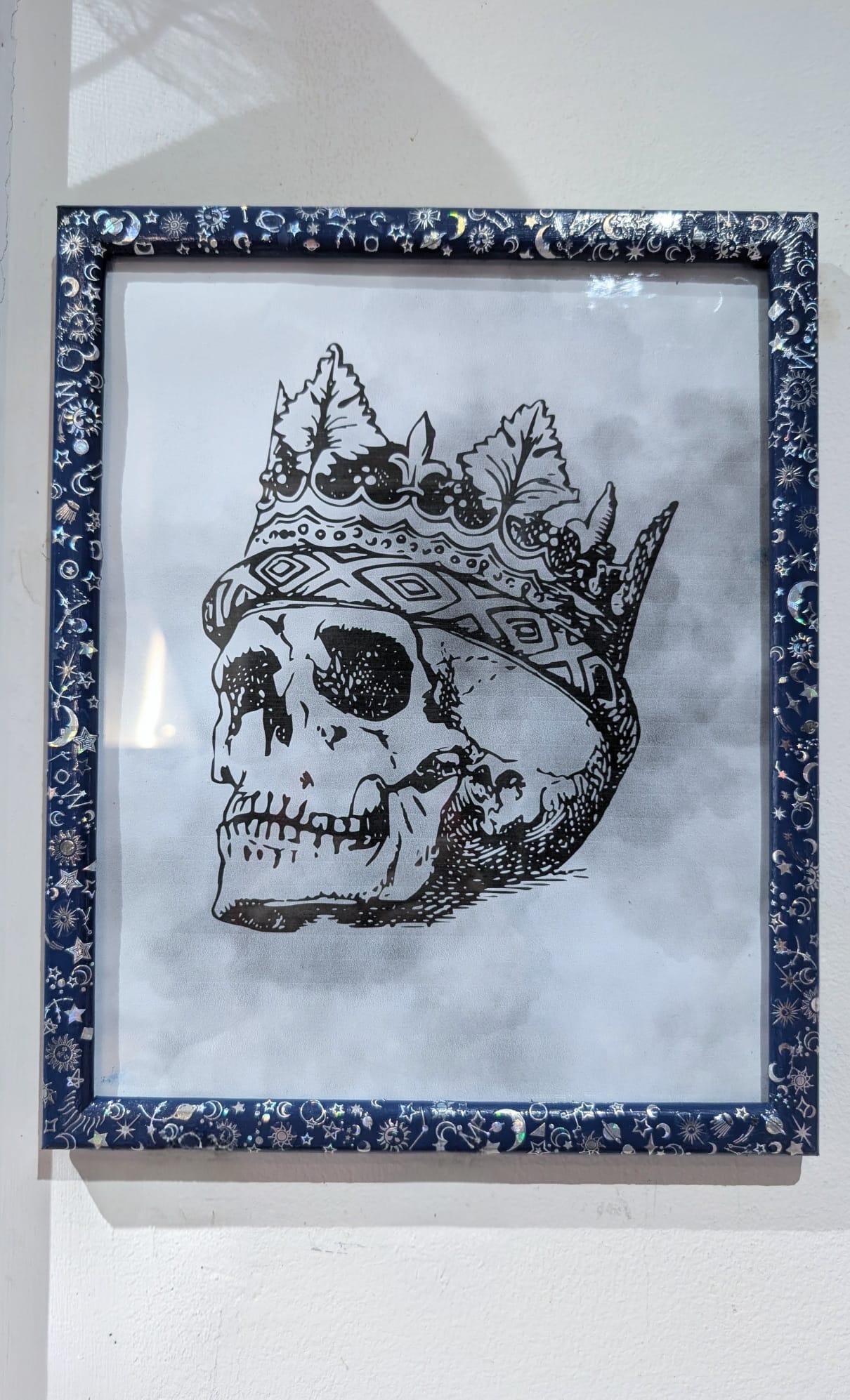 Hand-painted in blue, with silver holographic celestial transfers, all of which have been coated in clear varnish.