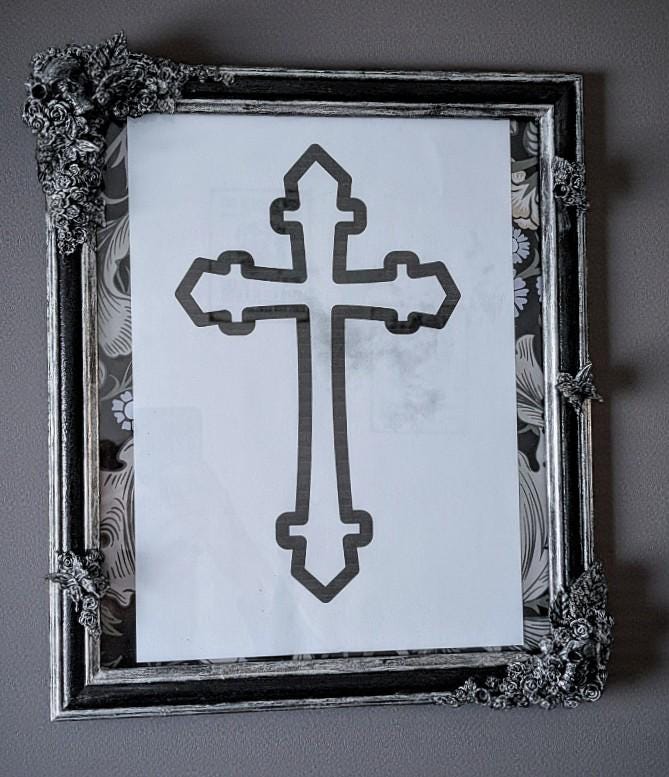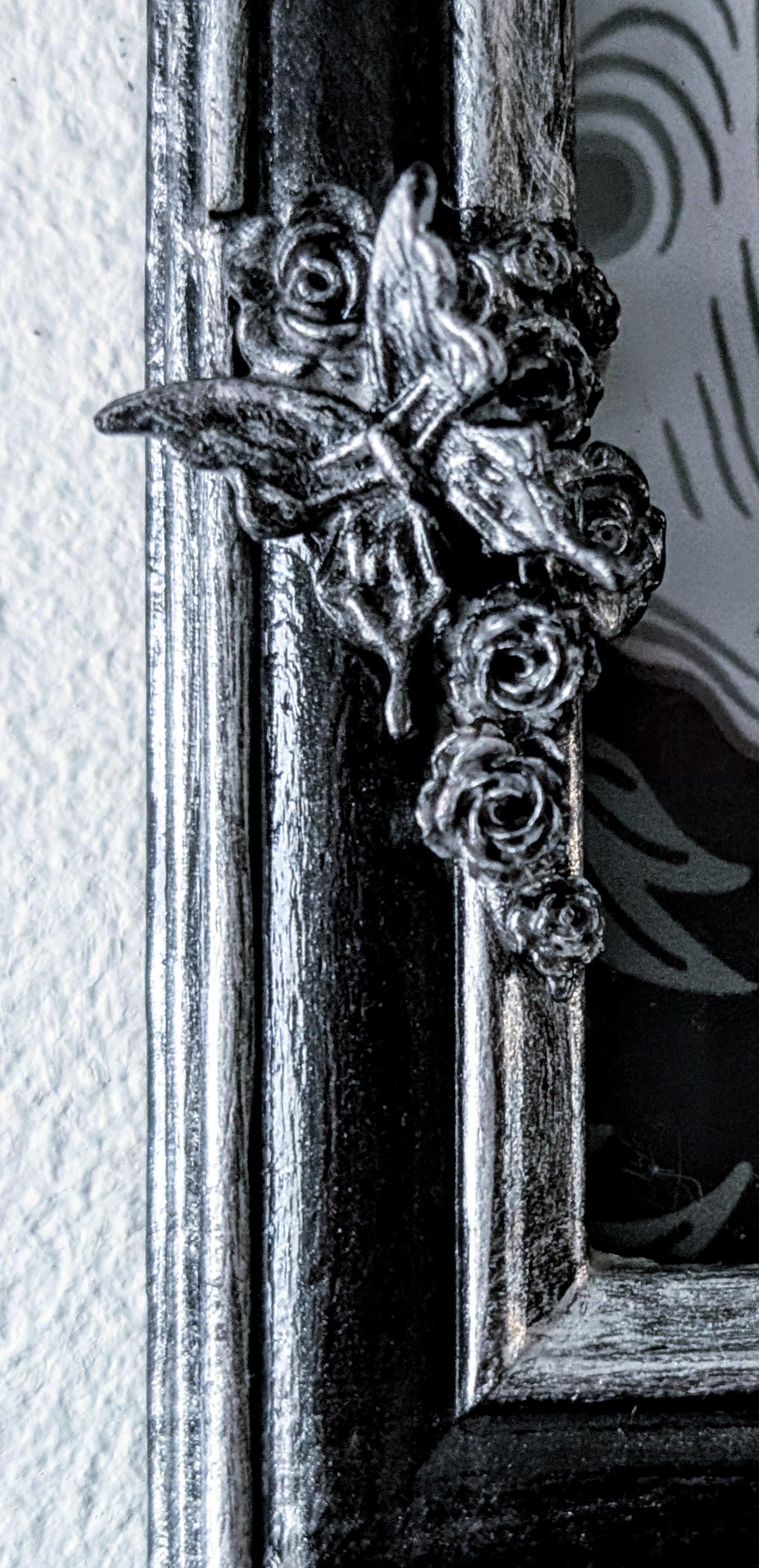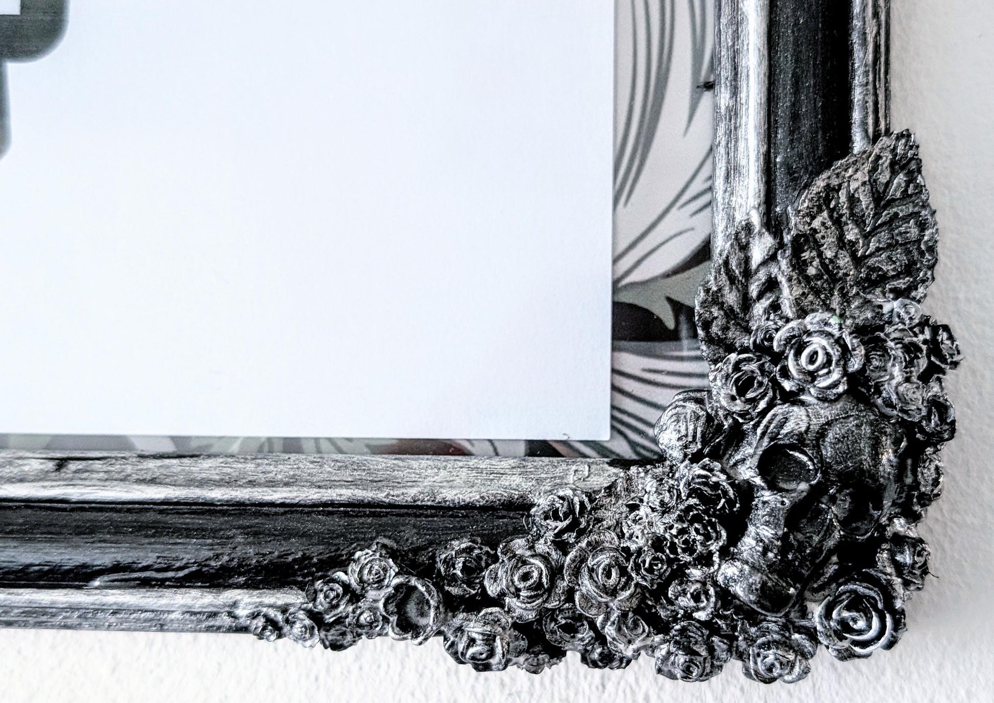 Black and silver gothic inspired picture frame. With roses, skulls, butterflies, roses, flowers, and foliage.