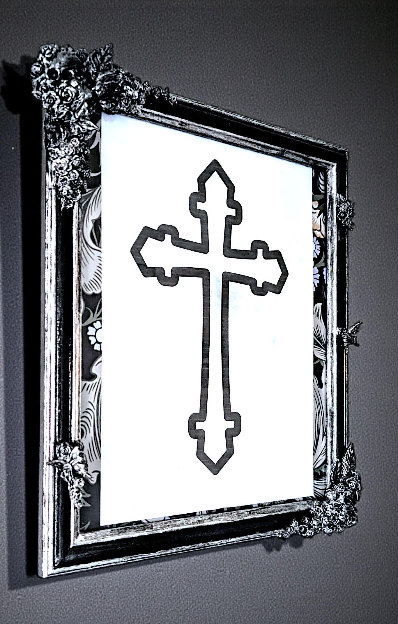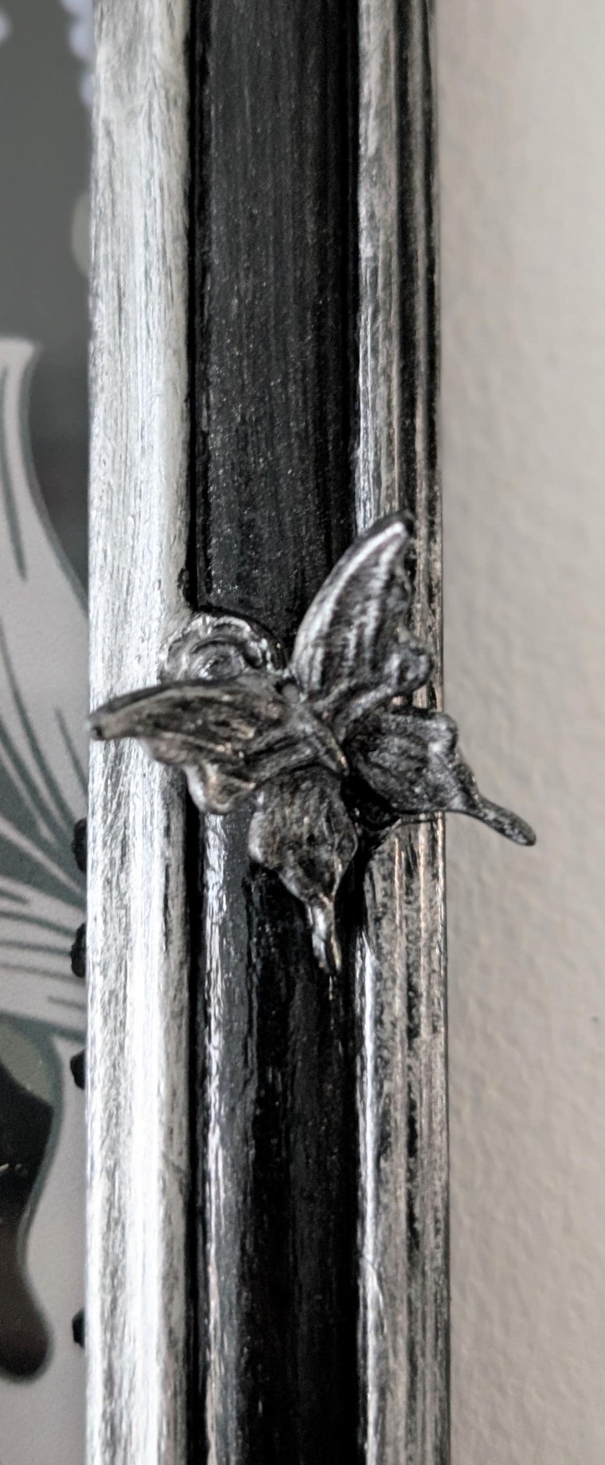 Painted black with a light brushing of silver metallic pqint, with hand embellished charms, some of which I have hand cast myself. Then coated in clear varnish.
