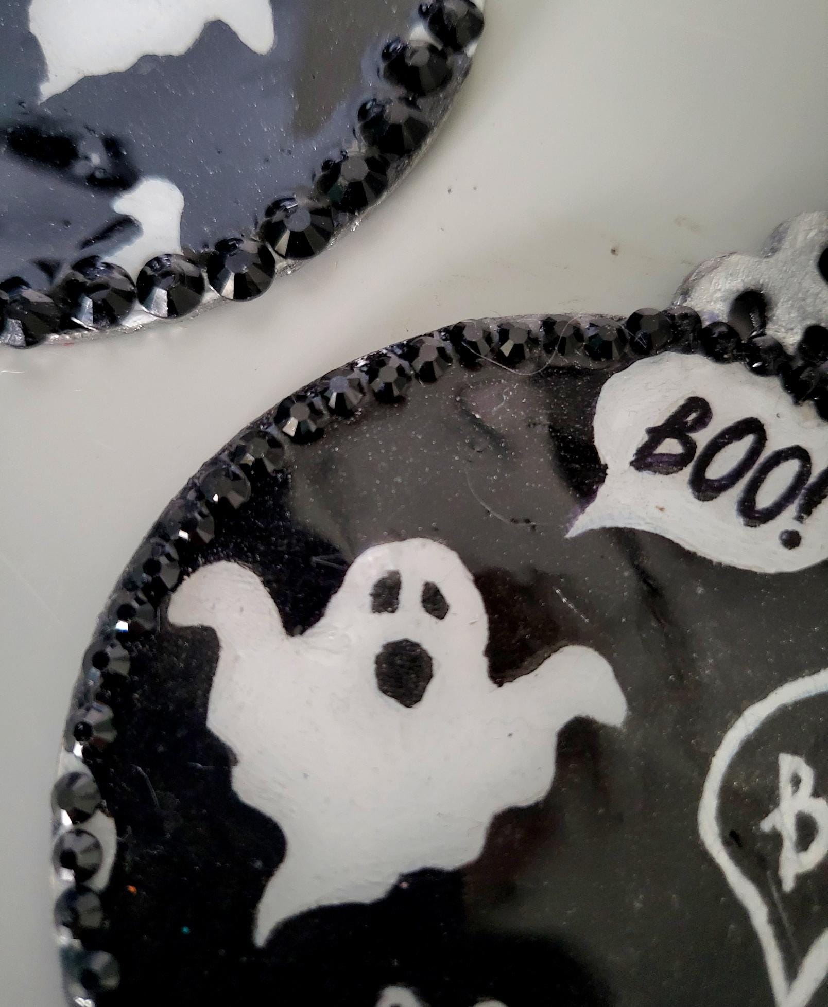 2 x Handmade Black & White Round Christmas Tree Hanging Decorations. OOAK Individually Made Ghosts Boo Halloween Xmas Keepsake Gift DEC4