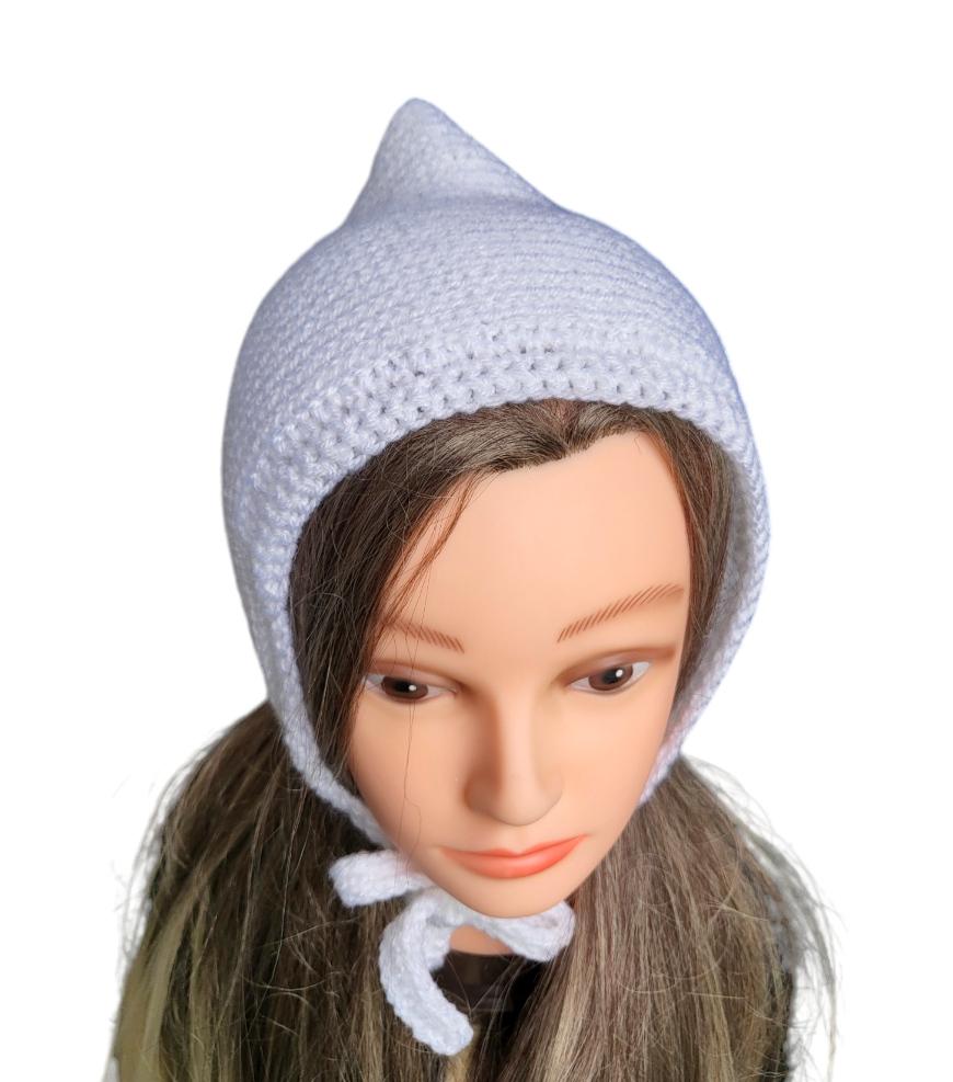 White Knitted Forest Bonnet Handmade Pixie Bow Tie Hat Adult Emo Goth Whimsy Elf Fairy Winter Gift HT19